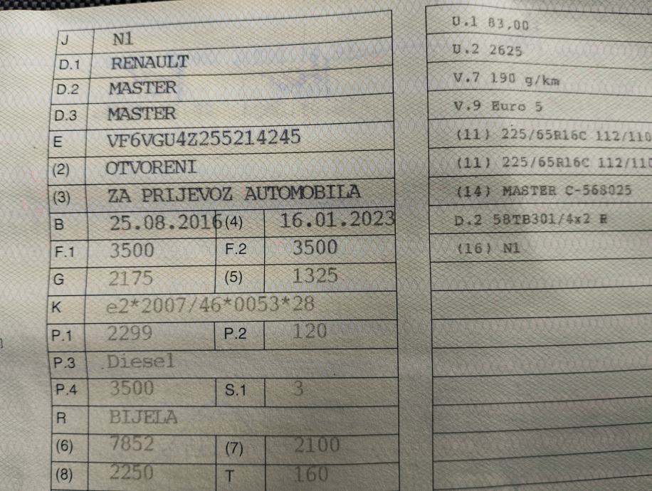 Renault master 2,3, 163 ks,2016 godina, vučna služba alu navoz , b kategorija sve ok, pali vozi rega izašla, ne mjenjam za ništa , cijena 16800 eura, zračni jastuci, 099-2920-630, digitalni tahograf, nove gume, servis napravljen, nije u sustavu pdv, na ime je vučna,