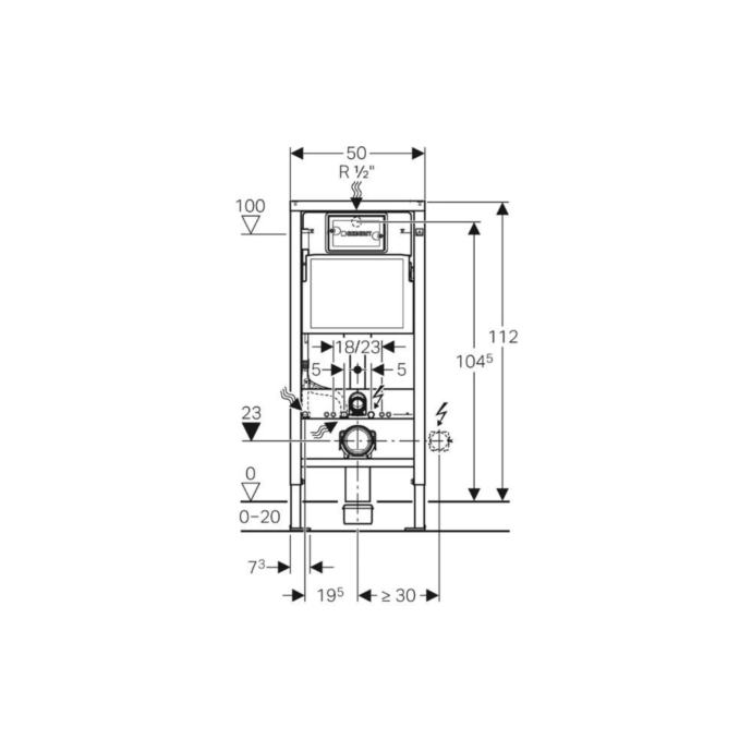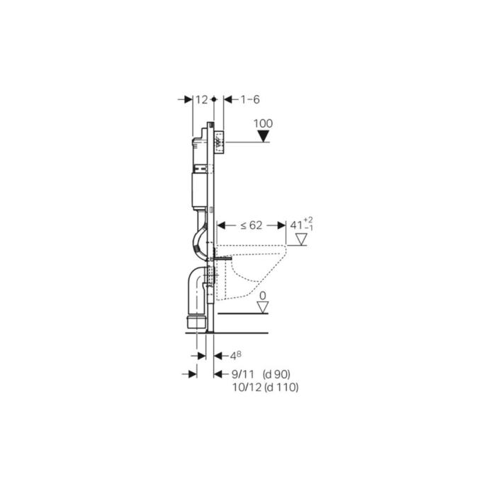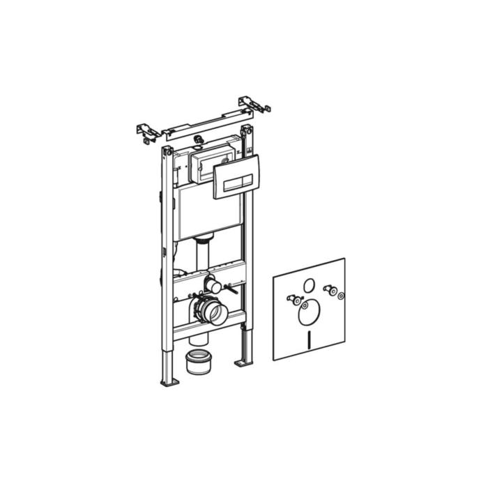 Duofix Basic montažni element za konzolni WC, s ugrađenim vodokotlićem Delta (UP100), aktiviranječeono, sa Delta51 tipkom, dodatnom gornjom prečkom i setom za predzidnu montažu, ugradbena visina 112 cm Za univerzalnu ugradnju: obzidavanjem ili u suhomontažnu konstrukciju s oblaganjem gipskartonskim pločama (18 ili 2 x 12,5 mm). - ugradbeni vodokotlić Delta (UP100) s dvokoličinskom tehnikom ispiranja 3/6 l Element sadrži: - montažni čelični okvir 40/40 sa dodatnom gornjom prečkom, sa zaštinim premazom plave Geberit boje - ugradbeni vodokotlić, izoliran od rošenja Delta (UP100) - Delta51 tipka (boja tipke ovisi o broju artikla) - visinski podesive nogice 0-20 cm - set za predzidnu montažu - 2 L-vijka za razmak koji nose građevinsku zaštitu ali i tipku! - univerzalni priključak vode 1/2" vanjski navoj, s ugrađnim kutnim ventilom - građevinsku zaštitu revizijskog otvora od stiropora deb. 6 cm - pričvršćenje odvodnog koljena na zatik - PE odvodno koljeno O 90/90 mm - PE prijelazni komad O 90/110 mm - garnituru manžeta O 90 mm - set zvučne izolacije - pričvrsni materijal