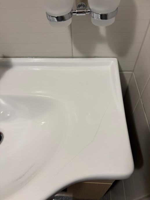 Kupaonica je funkcionalna i relativno očuvana, korištena samo povremeno jer je vikend kuća. Umivaonik ima oštećenje vidljivo na slici.
