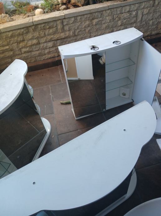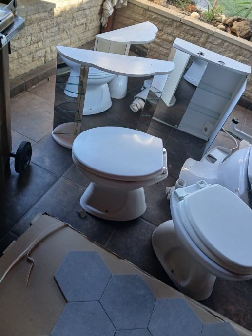 Prodajem rabljenu sanitarnu opremu. U ponudi se nalazi više komada: WC školjke s vodokotlićima, ogledalo s ormarićem i staklenim policama te kupaonski namještaj. Sve je bijele boje, standardnih dimenzija.