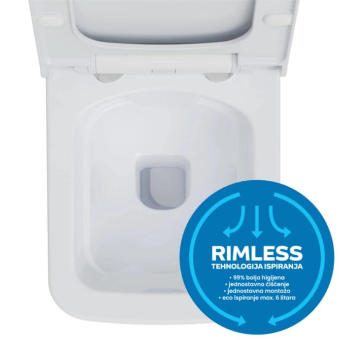 • Rimless tehnologija - toaletna školjka ravnog ruba, voda za ispiranje teče iz bočnih otvora, a snažan mlaz osigurava ispiranje