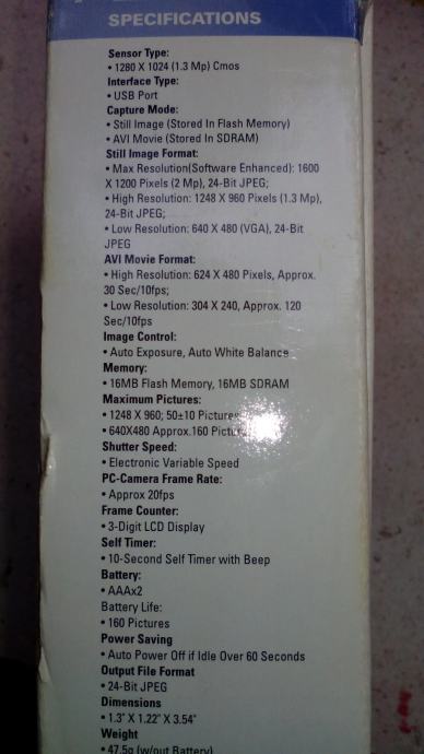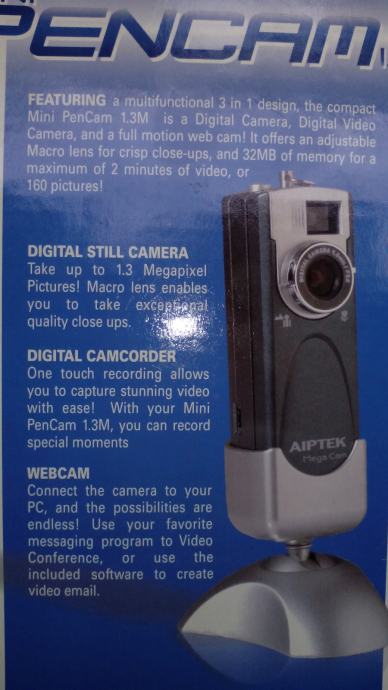 3 u 1 Digital camera, Digital Camcorder, Webcam. 1.3 mega pixel resolution, 32MB Built in memory, macro mode for close ups. Detaljne specifikacije na internetu. Ispravna u original pakovanju sa svim softwerima.