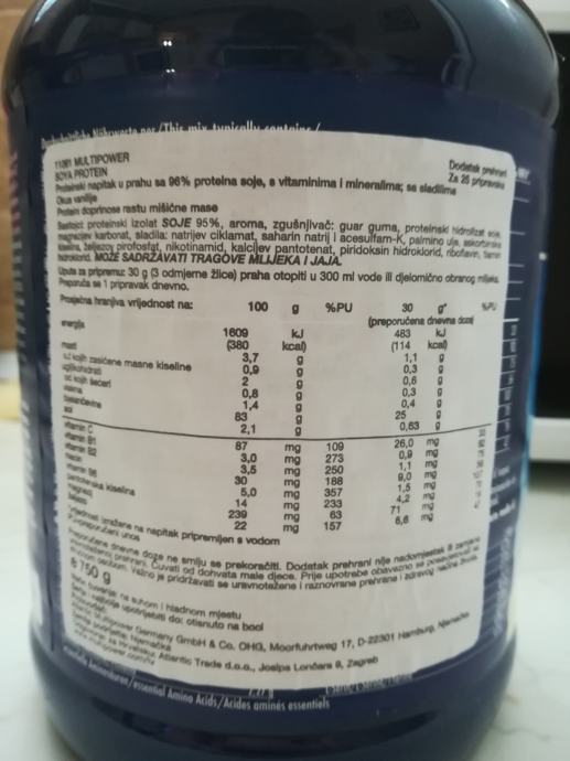 750 g proteina, proizvođač - Multipower, okus - vanilija. Izvađeno 30 g i iskorišteno za 1 shake. Razlog prodaje - prestanak korištenja whey proteina, ovaj sam dobio na poklon.
