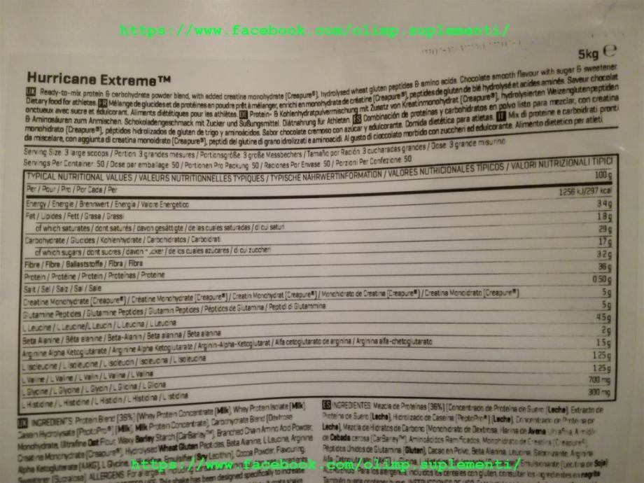 Hurrican Extreme je jedinstvena mješavina proteina, ugljikohidrata, aminokiselina (BCAA), kreatin monohidrata (Creapure®), beta alanina, arginin alfa-ketoglutarat (AAKG), leucina i glutamin peptida. Svi ti sastojci zajedno pružaju prikladan tretman oporavka koja se može konzumirati odmah nakon treninga.