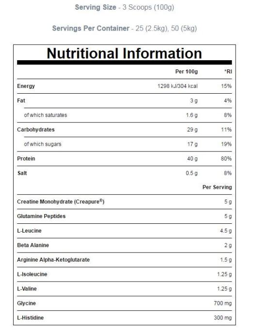 Pruža više od 40g proteina po obroku koji potiču iz kombinacije koncentrata proteina sirutke, izolata sirutke, kazein hidrolizata (PeptoPro®), i mliječnog koncentrata proteina. Ovaj visoki sadržaj proteina pomoći će pridonijeti rastu i održavanju čiste mase. Hurricane Extreme također pruža 5g kreatin creapure-a po obroku, što povećava fizičku izvedbu u uzastopnim eksplozijama kratkoročno te visokog intenziteta treninga.