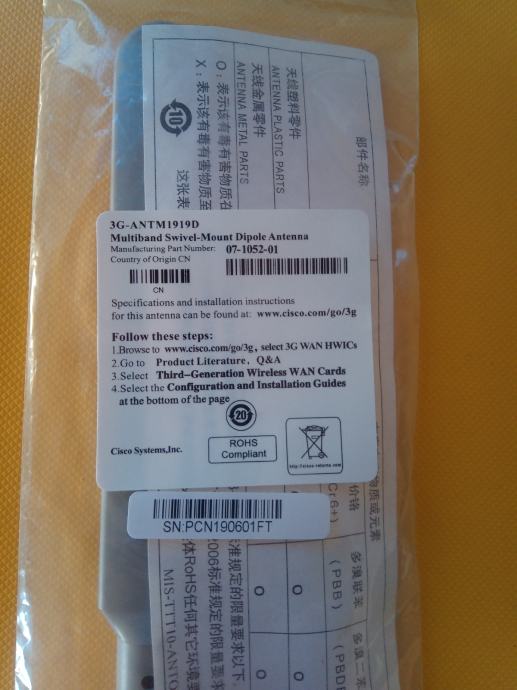 Cisco 3G-ANTM1919D antena radi u frekvencijskim pojasima od 806 do 960 MHz i od 1710 do 2170 MHz, a dizajnirana je za korištenje s Cisco 3G bežičnim karticama WAN sučelja velike brzine (HWIC). Cisco 3G-ANTM1919D antena kompatibilna je s Cisco 3G bežičnim WAN HWIC-ovima koji koriste navojni Neill-Concelman (TNC) muški konektor sa zglobnim spojem.