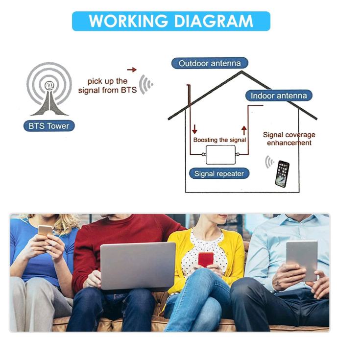 Funkcija repetitora signala: prvo preuzima signal vanjskog mobilnog telefona putem vanjske antene, a zatim prosljeđuje signal do repetitora preko koaksijalnog kabela, koji se koristi za pojačavanje signala, i konačno prenosi signal do unutarnje antene za poboljšanje pokrivenosti signalom mobitela.