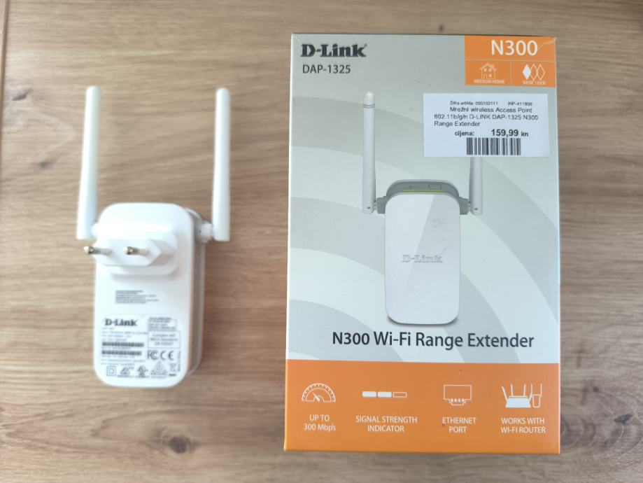 DAP-1325 N300 Wi-Fi Raspon Extender je prijenosni plug-in repetitor koji vam omogućuje da proširite postojeće bežične mreže. Jednostavno ga smjestite bilo gdje u vašem domu kako bi produžili vašu bežičnu mreža. Podržava Wireless N, mali, ali moćan N300 Wi-Fi extender daje brzine spajanja do 300 Mbps, a kompatibilan je sa postojećim bežičnim uređajima. 10/100 Fast Ethernet por, sigurnost WPA2/WPA, WPS. Ugrađeni čarobnjak za postavljanje i QRS mobilne aplikacije voditi ćeVas kroz instalaciju. 802.11n/g Wireless LAN, dvije vanjske antene za bolji prijem, Web UI, dimenzije 97.9 x 50.7 x 48.7 mm, težina 97 grama. 110 to 240 V AC, 50/60 Hz
