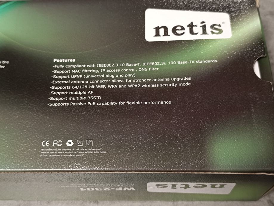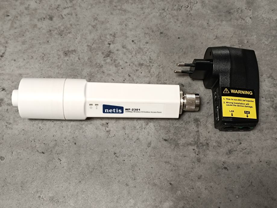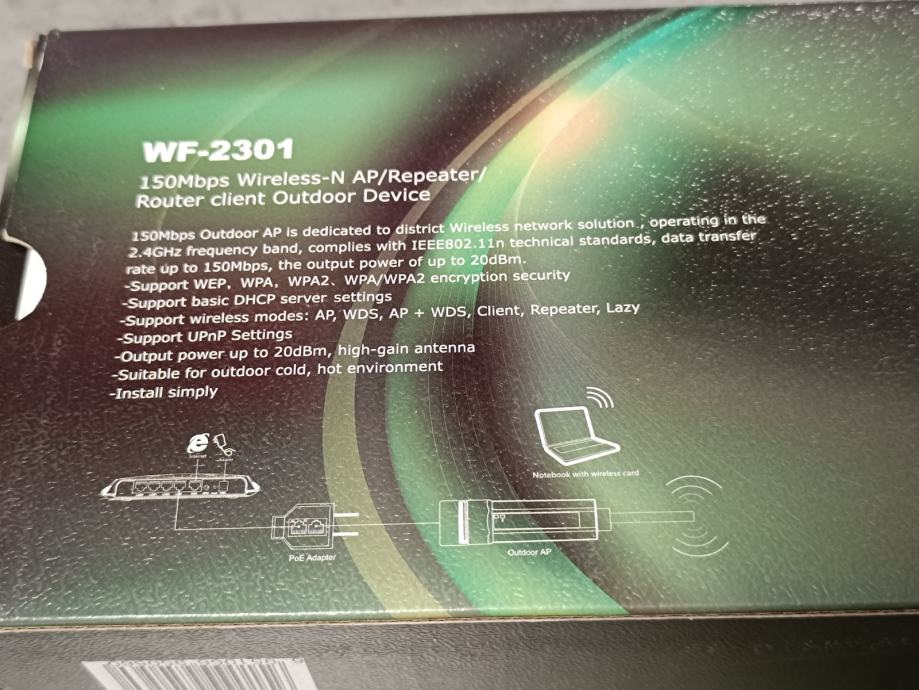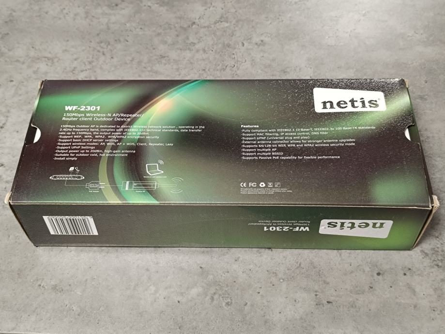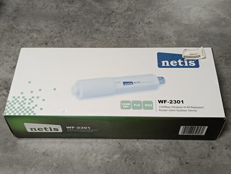 Netis WF-2301 150Mbps Wireless-N Access Point 802.11b/g/n / Repeater, Router client, outdoor, nekorišten, s njim ide i POE adapter. Spaja se na vanjsku antenu, od AP-a ide mrežni kabel na PoE i do modema (routera), te nema gubitaka na signalu kao kod pigtail kabela.