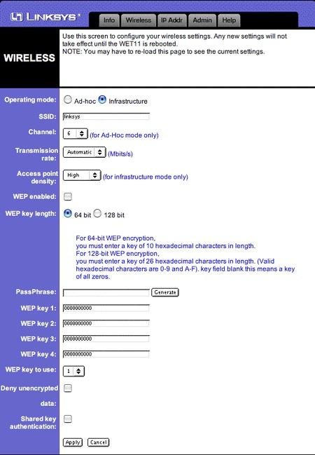 The Wireless tab lets you choose to configure the WET11 to connect either in ad hoc (machine-to-machine bridging) or in infrastructure mode, the standard for connecting in a wireless LAN. The rest of the settings are familiar to anyone who has added a wireless client to a network (enter the settings necessary for a single client). You can also control some of the tweakier settings, like Transmission Rate (locking the WET11 into strict 11Mbps mode) and access-point density, which controls how much interference elimination the system tries for.