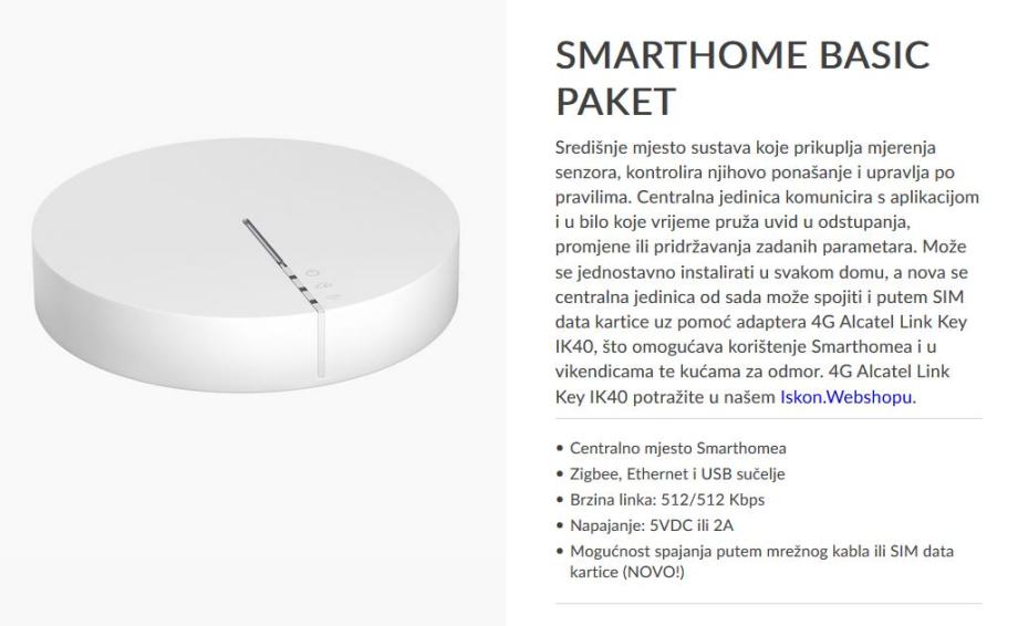 Iskon.Smarthome omogućuje povezivanje pametnog telefona s vašim domom uz centralnu jedinicu, kameru, senzor klime i pokreta te pametnu utičnicu. Uz Iskon.Smarthome, vaš dom postaje pametan, umrežen i siguran. U svakom trenu možete provjeriti stanje u domu, primati obavijesti o promjenama parametara koji su vam bitni, upravljati uređajima koji su dio Smarthomea ili su s njim povezani, napraviti profil za više prostora ili dodavati nove senzore.