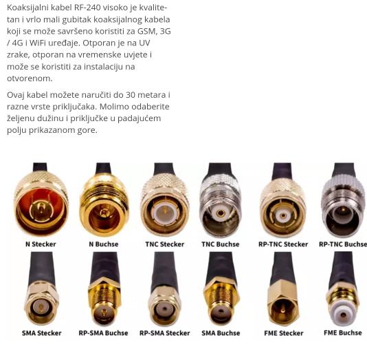 RF-240 antenski kabel vrlo je kvalitetan antenski kabel s niskim gubitkom. Možete naručiti kabel različitih duljina s različitim utikačima. Jednostavno odaberite priključak i duljinu.
