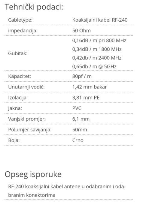 Koaksijalni kabel RF-240 visoko je kvalitetan i vrlo mali gubitak koaksijalnog kabela koji se može savršeno koristiti za GSM, 3G / 4G i WiFi uređaje. Otporan je na UV zrake, otporan na vremenske uvjete i može se koristiti za instalaciju na otvorenom.