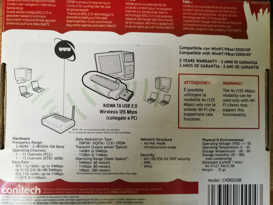 Conitech Kiowa USB WiFi Wireless Adapter Network 125 Mbs za kućno računalo ili laptop koji nema ugrađen WI-FI. Original kutija, instalacijski CD, malo korišteno.