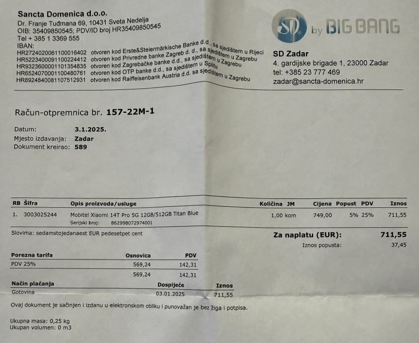 Prodajem Xiaomi 14T Pro 12 GB, 512 GB Titan Blue kupljen u Big Bang-u. Posjedujem originalni račun (datum kupnje 03.01.2025. što znači da ima još uvijek garanciju). Originalna kutija (popratni sadržaj poput kabela za punjenje i originalne maskice koja je došla uz uređaj) i punjač od 120 W (kupljen posebno, nemam kutiju i račun od njega). Uređaj je u dobrom stanju, nema nigdje nikakvo veće oštećenje. Na zaslonu ima par tankih crtica koje se teško vide prilikom korištenja (pogotovo uz zaštitno staklo ili foliju). Svakako sam pokušao uslikati pod svijetlom da bi se bolje vidjelo.