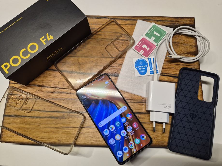 Prodajem rabljeni Xiaomi POCO F4 mobilni telefon u potpunoj opremi. Uređaj dolazi s originalnom kutijom, punjačem, kabelom i nekoliko zaštitnih maski. Telefon je u dobrom stanju s minimalnim znakovima korištenja.