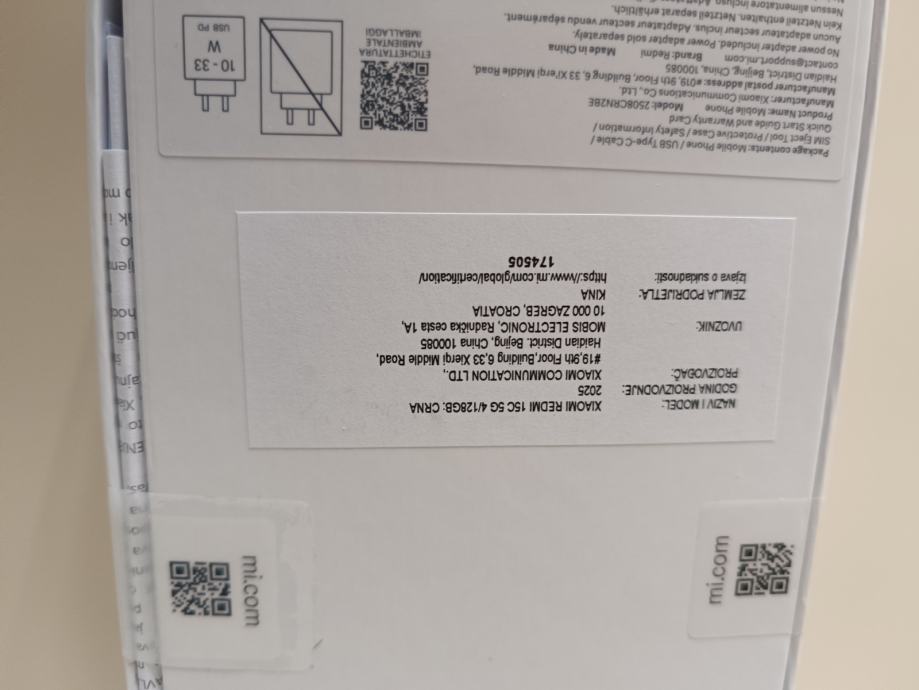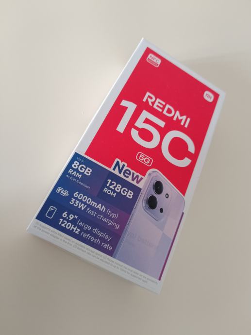 Novi /neotvoreni Xiaomi REDMI 15C 5G mobilni uređaj u originalnom pakiranju.. Telefon ima 8GB RAM-a, 128GB interne memorije,60000mAh/33w brzi punjač