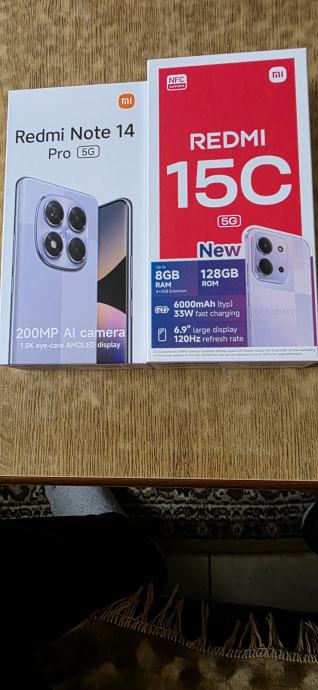 Redmi note 14 pro 5g- jaci model od 8/256gb midnight black boja cijena 200eu. i redmi 15c 5g- noviji model sa 5g mrezom i 8/128gb midnight black boja cijena 100eu.