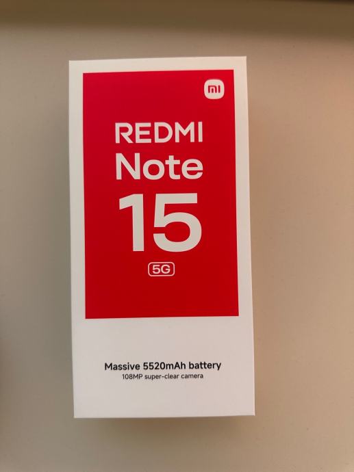 Prodajem nov Xiaomi Redmi Note 15 5G u crnoj boji. Mobitel je potpuno nov i neotpakiran. Dolazi s baterijom kapaciteta 5520 mAh i kamerom od 108 MP.