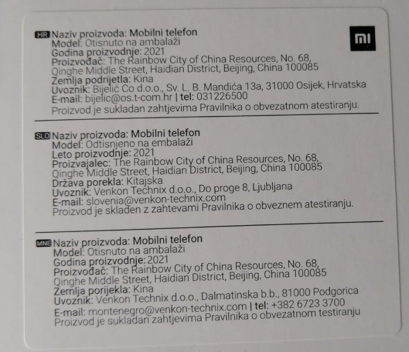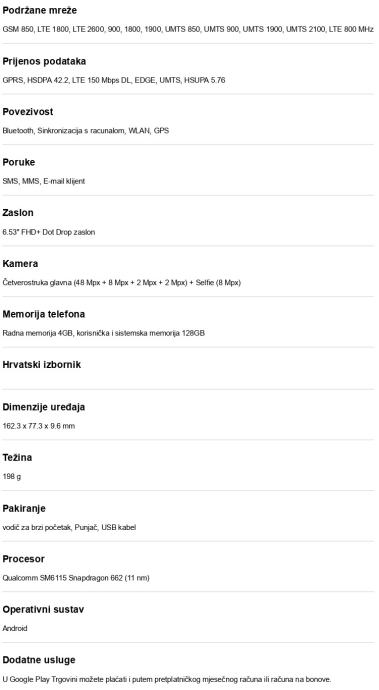 Kamera Četverostruka glavna (48 Mpx + 8 Mpx + 2 Mpx + 2 Mpx) + Selfie (8 Mpx)