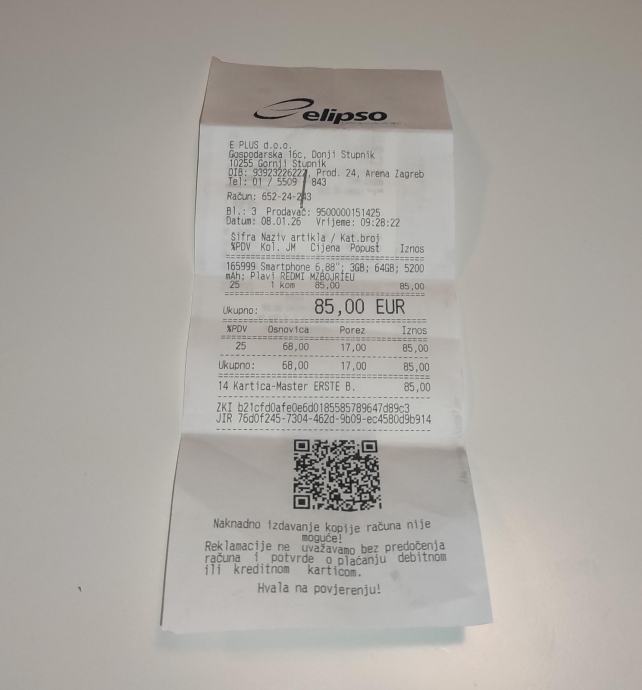 Slika računa je u prilogu na kojoj piše cijena i datum kupnje (85 e, 8.1.2026.).
