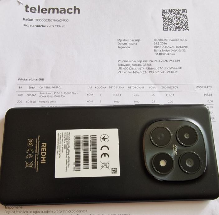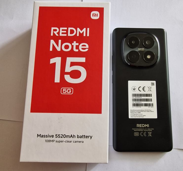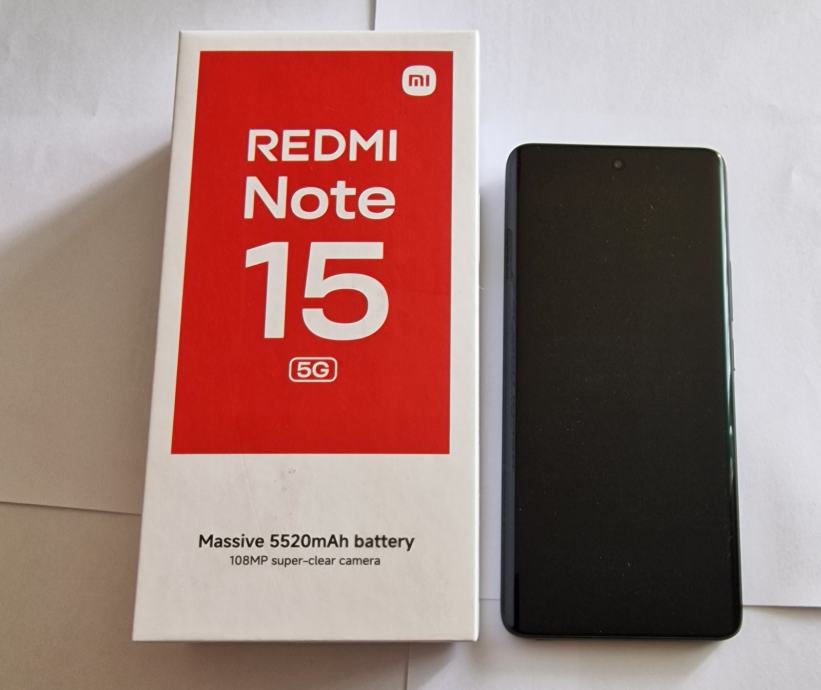 Xiaomi Redmi Note 15 5G 8gb-256gb kupit 24.03.2026 samo isproban. Mobitel posjeduje kutiju, maskicu i račun od Telemacha.