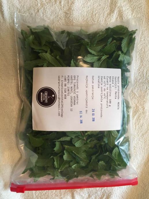 Pakirana očišćena menta i spremna za upotrebu! Cijena za pakiranje samih listova od 180 grama, moguće izdavanje računa.