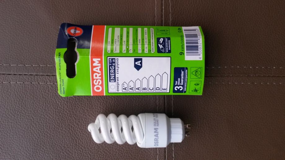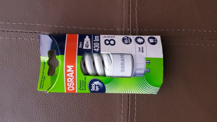 Prodajem 6 potpuno novih neraspakiranih štednih žarulja Osram Dulux superstar Nano Twist 9W-825 GU10, hladna boja svjetla. Cijena po komadu 40 kn, cijena kompleta 200 kn.