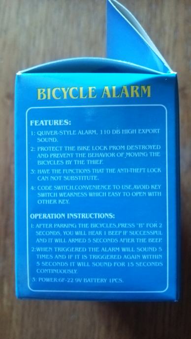 Alarm: napajanje 1x 6F22 9V baterija (bez baterije)