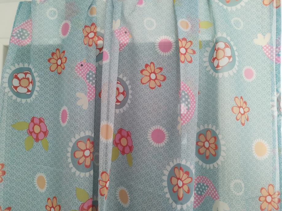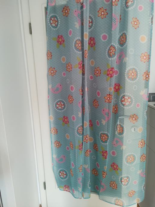 2 komada zavjesa, veseli djecji motiv, prozračna tkanina tirkizne boje. Na trakice. 135 x 240 (+10cm trakice). Uredne. Neoštećene.
