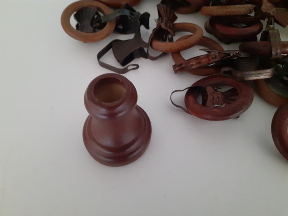 Bakreni držači za zavjesu s drvenim prstenima, , 33 komada fi 43/27, plus razni dodaci , sve 30 eura.
