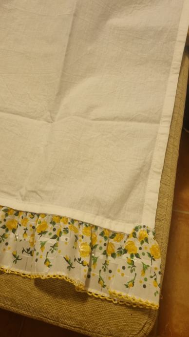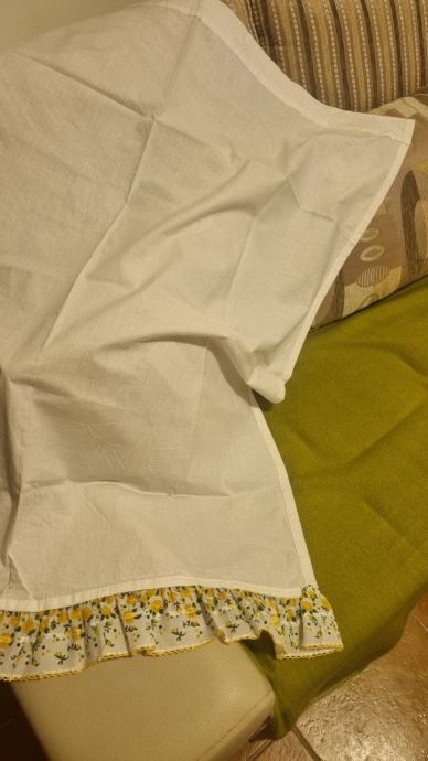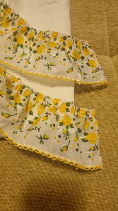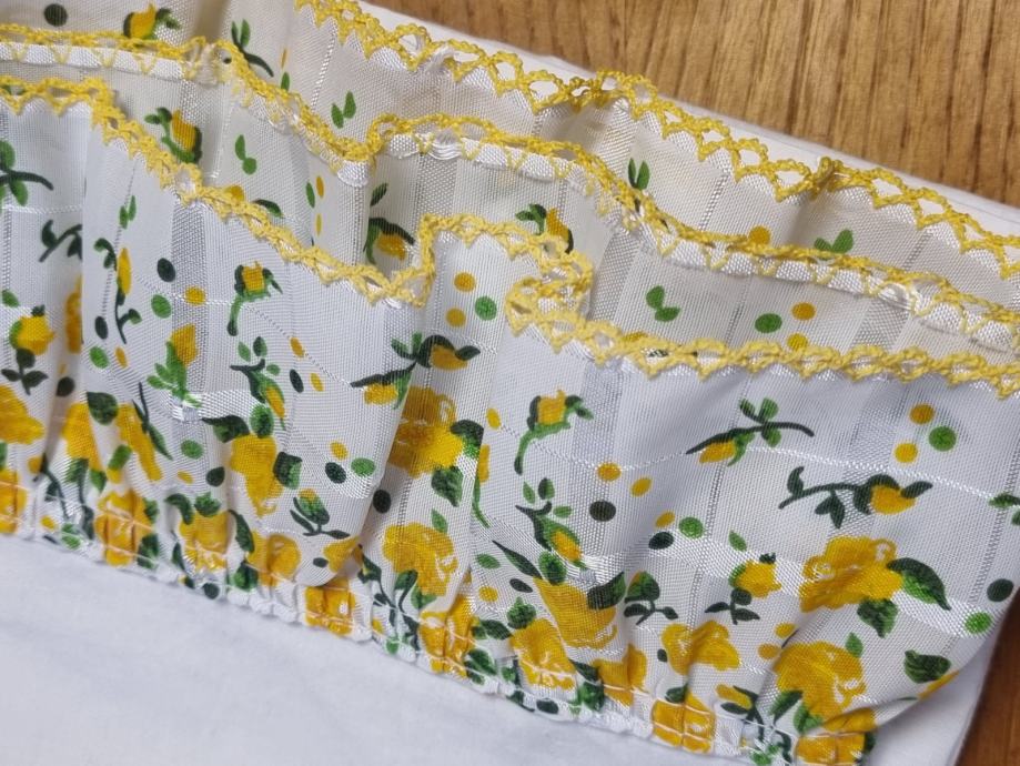 Na prodaju dvije zavjese za kuhinjski prozor sa žito zelenim prišivenim dekorom. Potpuno očuvane + dva dodatna dekora koja možete koristiti po želji.