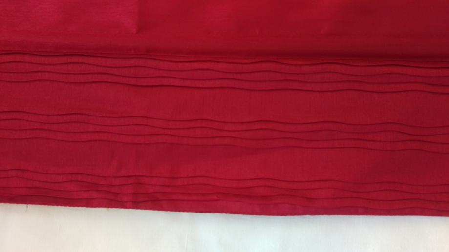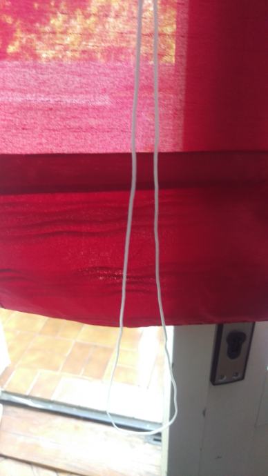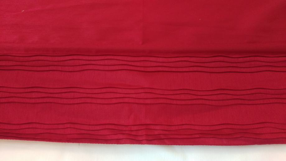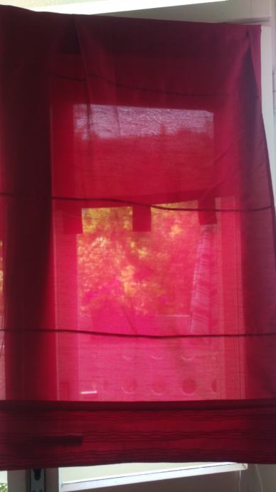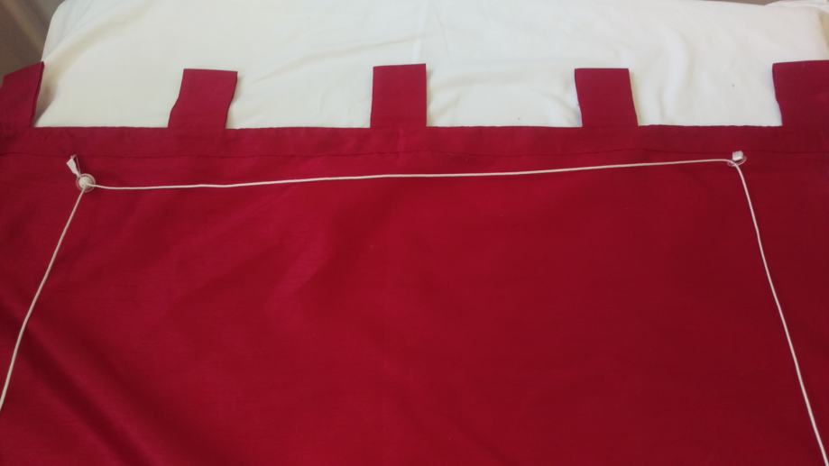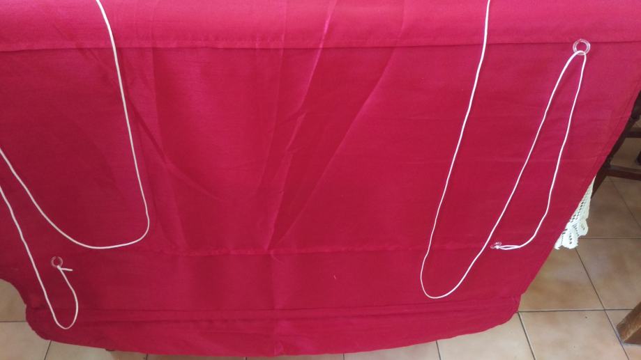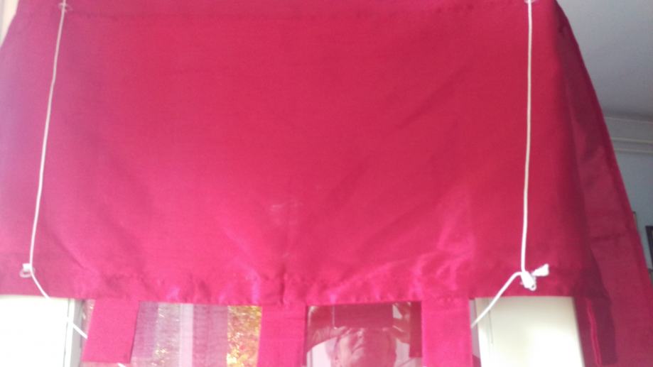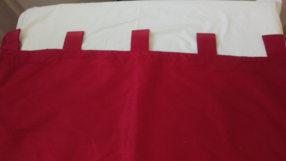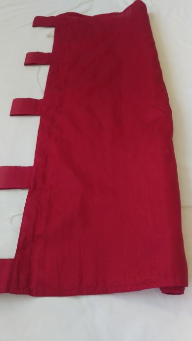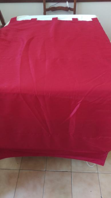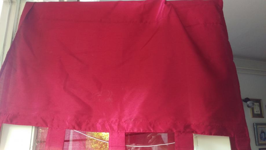 Prodajem konfekcioniranu zavjesu od bordo ripsa. Visina zavjese je cca 172 cm, a to uključuje 7cm traka za objesiti ( 5 kom) i 15 cm ukrasnog ruba, koji ima ukrasne nabore ( vidi slike). Rub je odjeljen od zavjese s drvenom šipkom da zavjesa lijepo pada. Širina zavjese je cca 80cm. Zavjesa ima uzdužne trake pa se može nacigati i ujedno skratit zavjesu prema potrebi.
