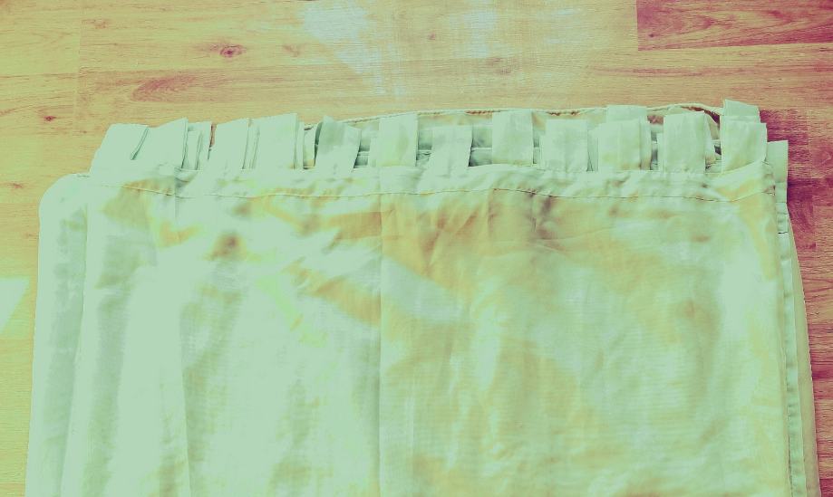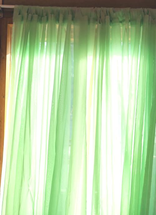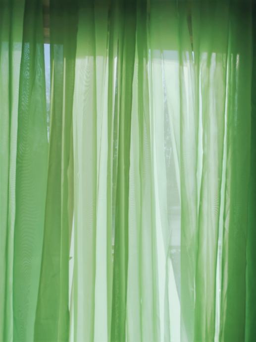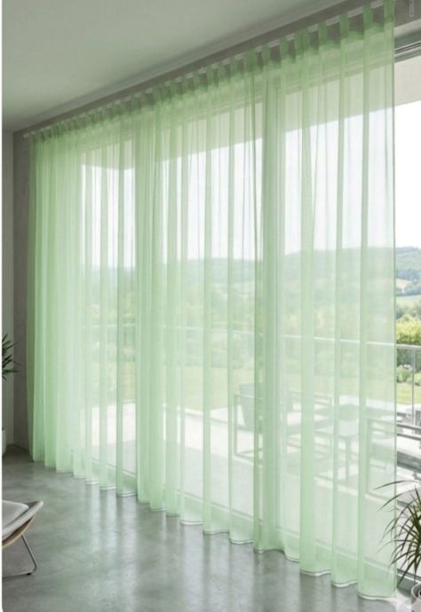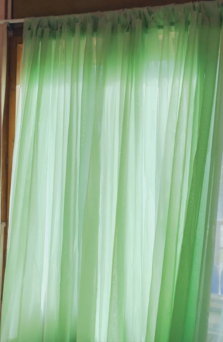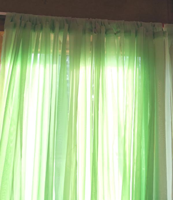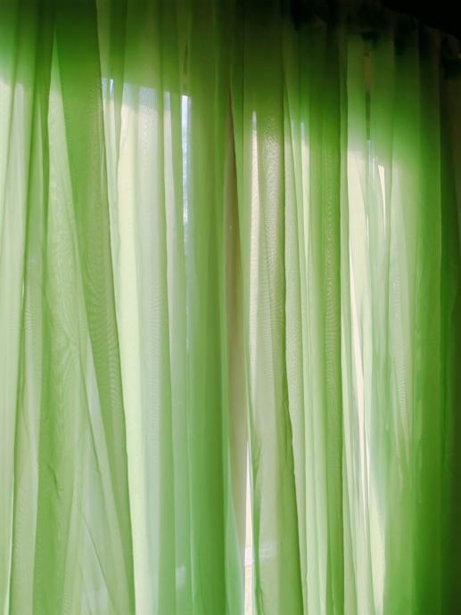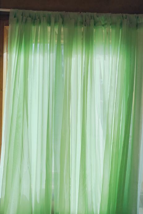 Velika, sačuvana zavjesa boje mente, duljine 7 m i visine 2.20. Od mješavine viskoze i poliestera. Navodi se na karnišu.