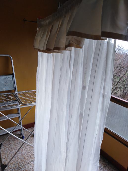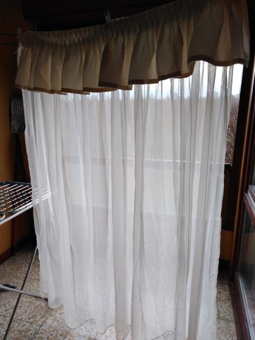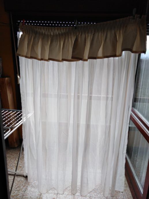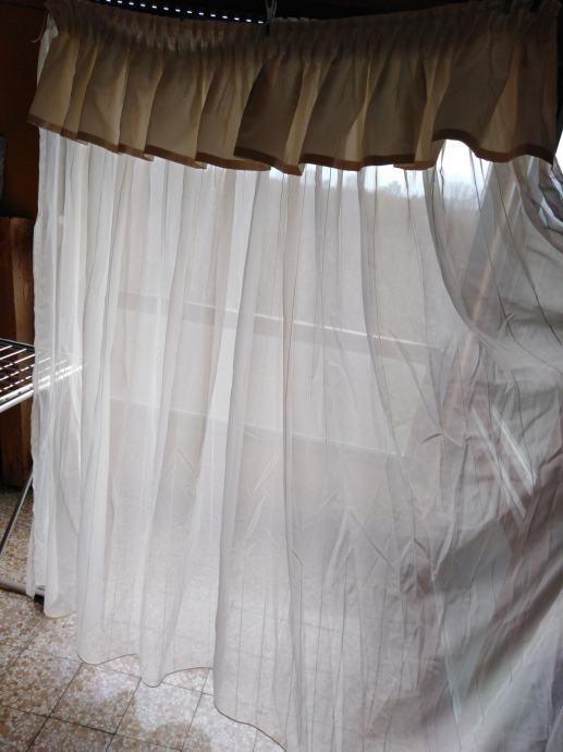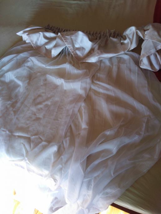 Prodajem zavjesu nježno bijele boje za vodilicu dužine 110 cm, zavjesa je širine 285 cm i dužine 170 cm, . Uz zavjesu dajem i odgovarajući dekor širine 30 cm koji prati dužinu vodilice. Zavjesa je od sintetike šivana po mjeri u Kiki.