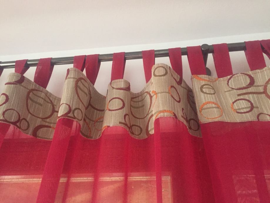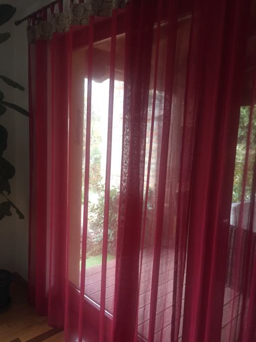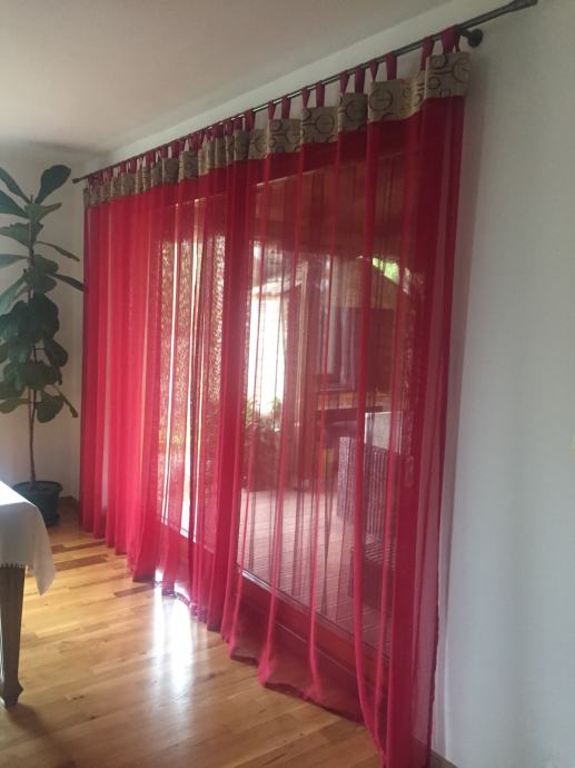 Kvalitetne lanene crvene zavjese na tregere. Nije potrebno peglati, lagane za održavanje. Šivane po mjeri. 2 kom dimenzija: širina 280 cm, visina 232 cm.