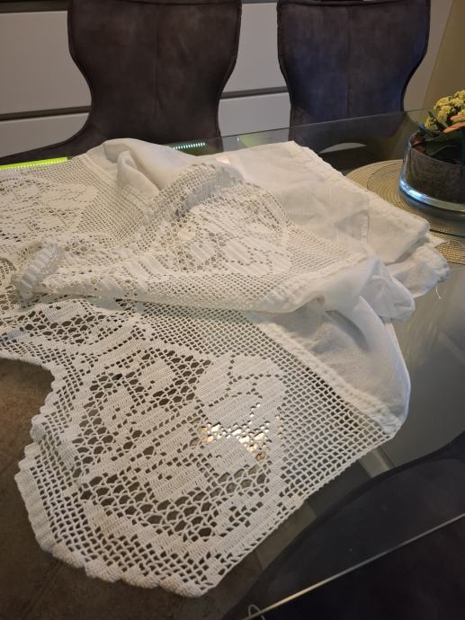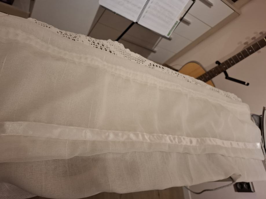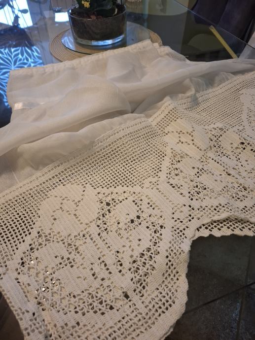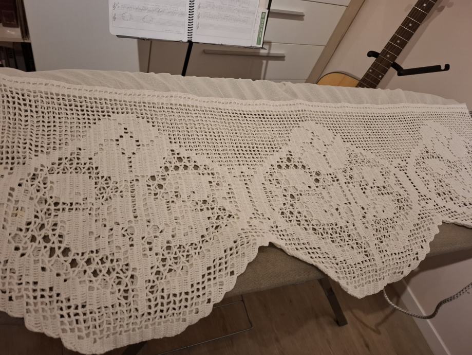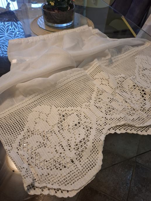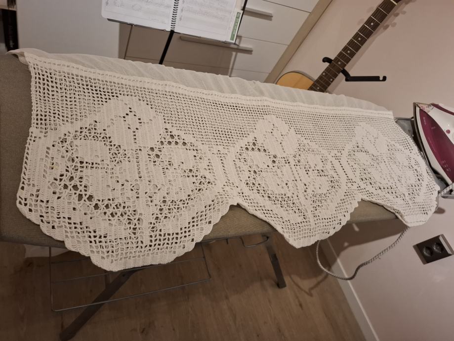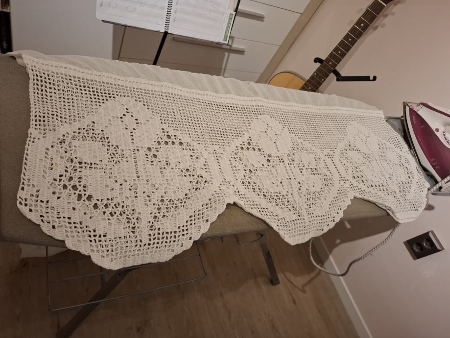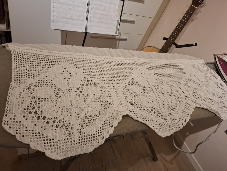 Zavjesa visina 132cm, širina 180cm bijela, sa ušivenom trakicom i heklanim završetkom (ručni rad, unikat). Mob. 091-9233628. Više detalja može i na WhattsUp
