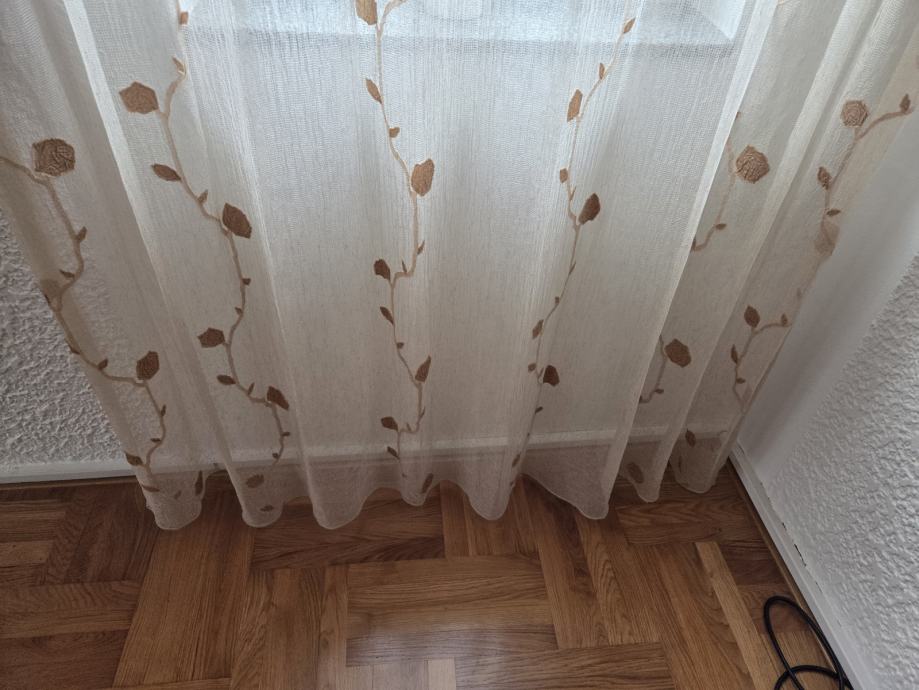 Dimenzije: kratka širina 255 cm, visina 173cm. 1. dugačka zavjesa visina 252cm, širina 180cm, 2. dugačka zavjesa visina 255cm, širina 220cm.