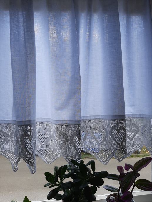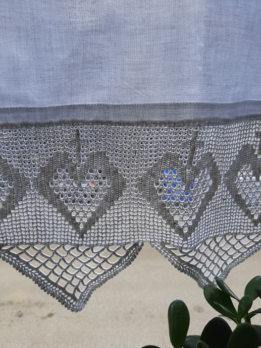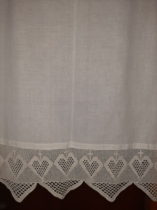 Nova zavjesa ručni rad, izuzetna čipka s motivima srca i križa. Veličina zavjese: visina 95 cm× dužina 164cm. Zavjesa se može postaviti ravno ili s faldicama i naborima. Ako je potrebno može se smanjiti prema veličini prozora.