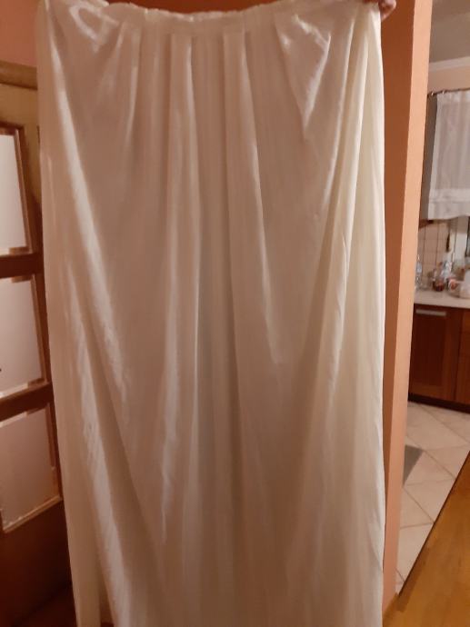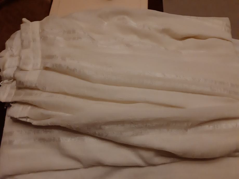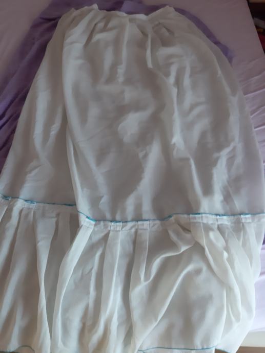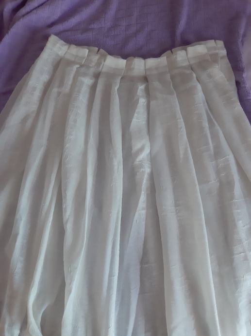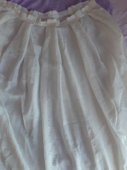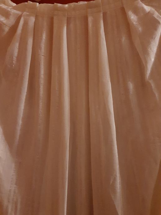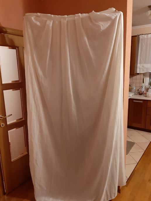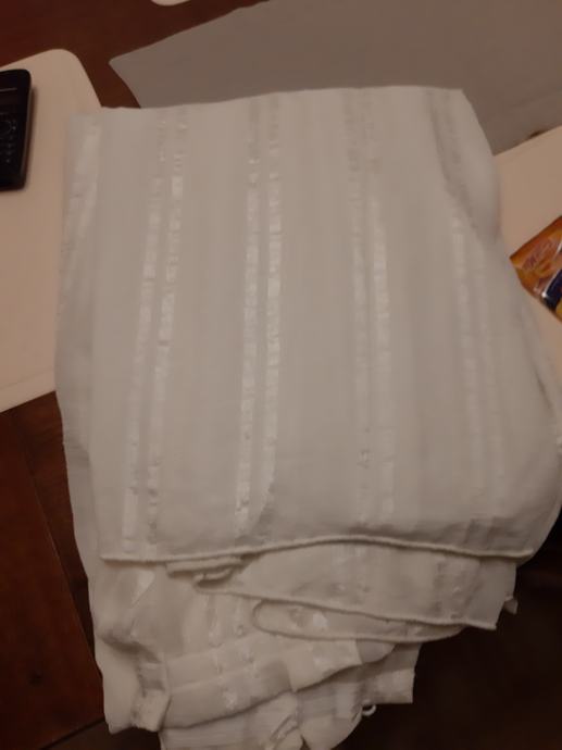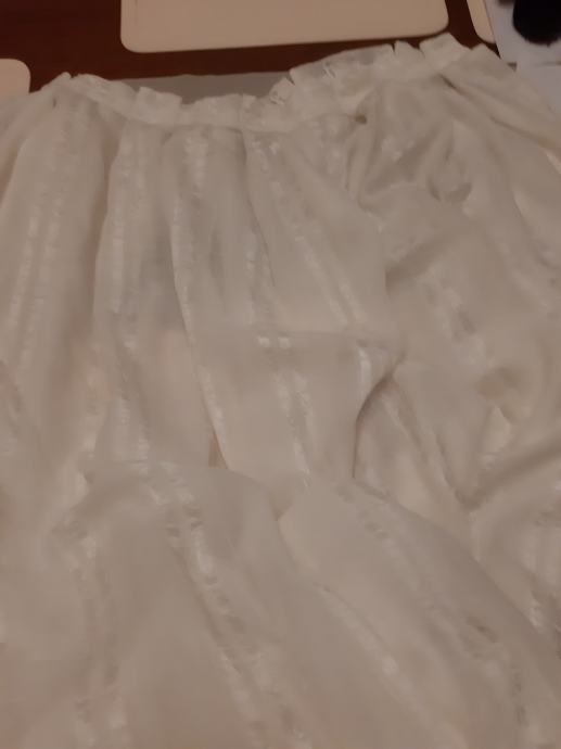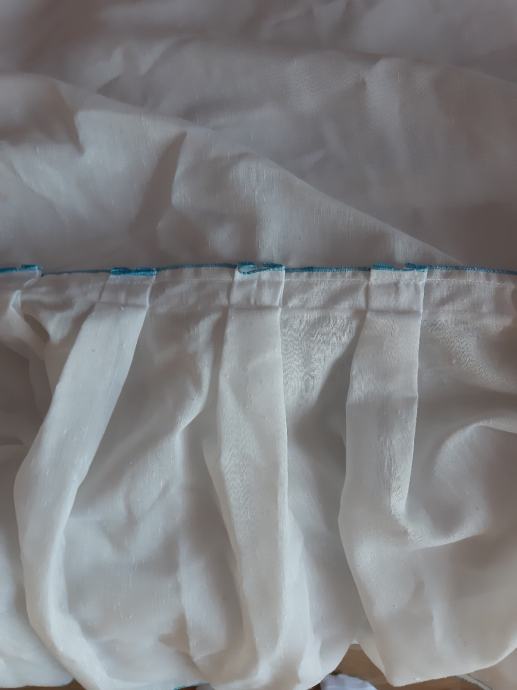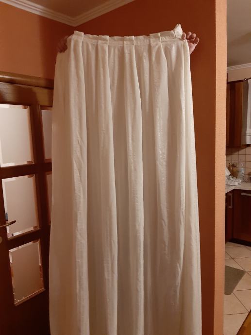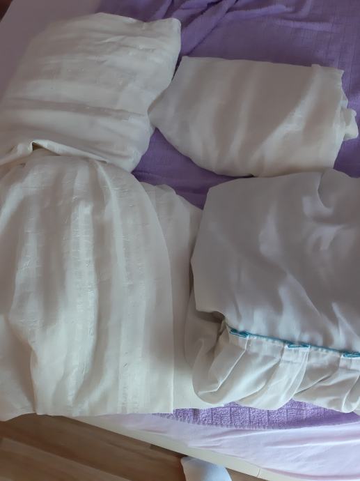 Prodajem 4 zavjese u dobrom stanju,sasivene na faldice sa trakom. Dimenzije; 1 je sirina 1m a duzina 90cm,sivana je kao luk u sredini luka je duga 70cm. 2 je siroka 1.5m i dugacka 1.5m. 3 je dugacka do poda 2.20m i 1.70m. Te tri su od istog materijala ,guzvani markizet koji se ne pegla u krem boji. I 4 je isto krem sa volanom i ima plavi rub,od gustog materijala koji se ne pegla,sirina 2m i duzina 1.5m. Cijena po komadu ili po dogovoru. Mogucnost slanja postom.