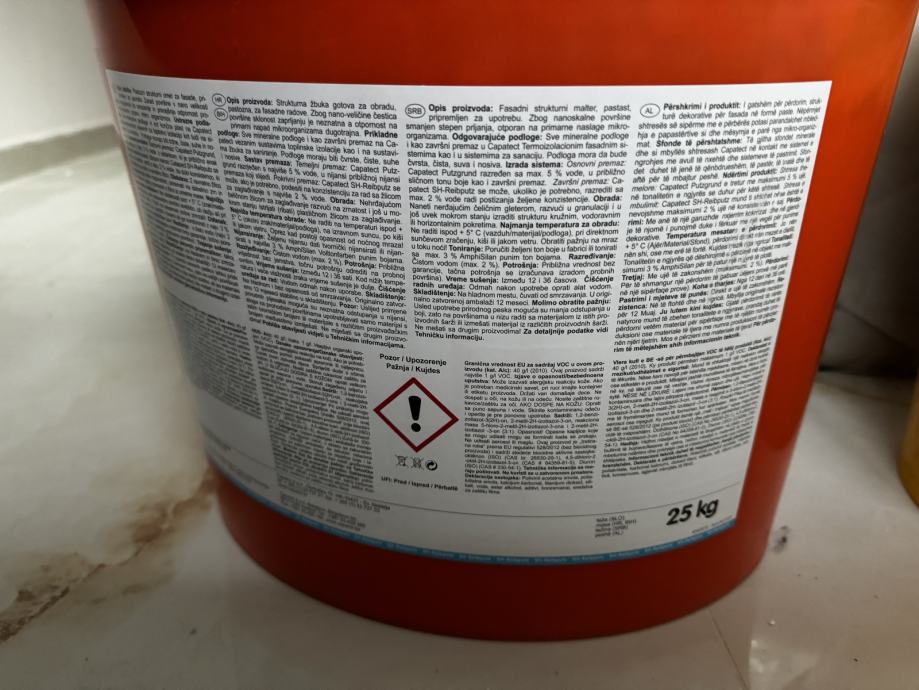 Prodajem potpuno novu bež strukturnu žbuku vezanu silikonskom smolom, namijenjenu za fasadne površine i kao završni premaz u povezanom sustavu za toplinsku izolaciju Capatect.