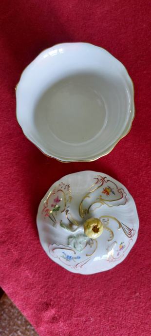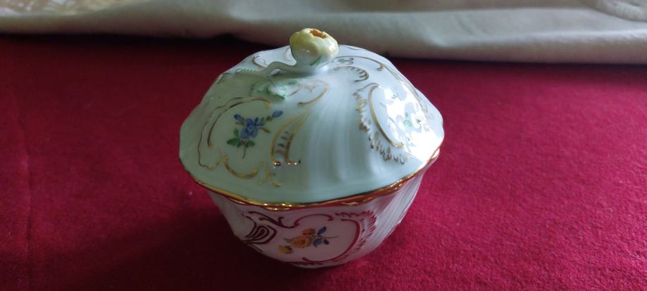 Prodajem dozu za šećer ili bonbone, marke Meissen s mačevima, visina 8 cm, oslikanu nježnim cvijećem, a poklopac reljefno oblikovan.