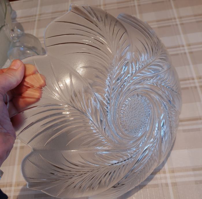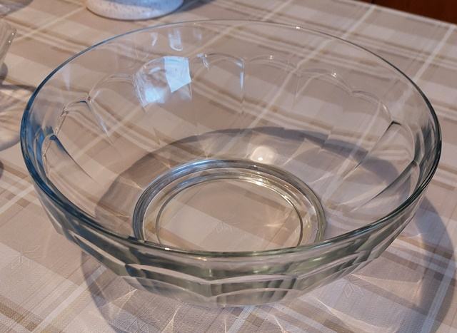 Dvije zdjele za voće ili salatu. Nekorištene, dobivene na poklon, velike. NIJE KRISTAL. Prva je više ukrasna, a druga je debelo, izdržljivo staklo. Cijena za ovu kao cvijet 7 eura, promjer 33 cm, a za ovu jednostavnu od debelog stakla 3 eura. Zagreb, Trešnjeka, Dugo Selo, Sesvete.