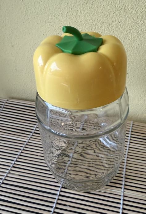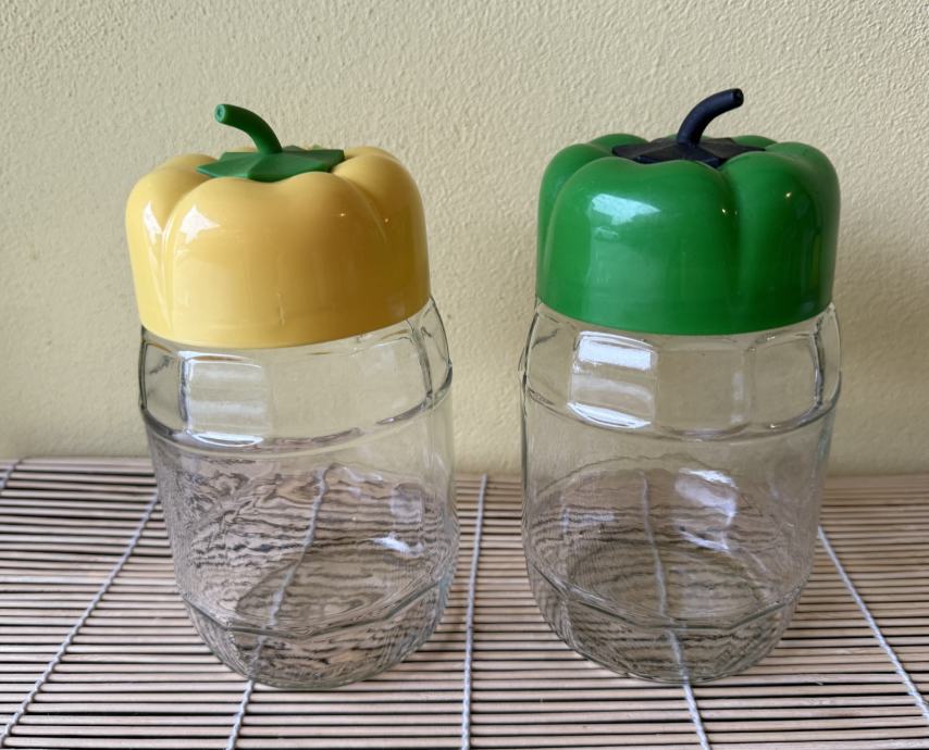 Savršeno stanje, 72 cl po posudi. Za pohranu s upečatljivim poklopcima u obliku žute i zelene paprike. Staklenke su u obliku bačvice, prozirne i vrlo kvalitetne izrade. Idealne su za: Pohranu začina, šećera, kave ili čaja. Kao držači za kuhinjski pribor. Dekoraciju za kuhinje u retro ili "country" stilu.