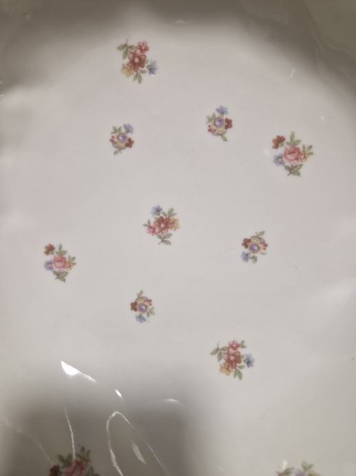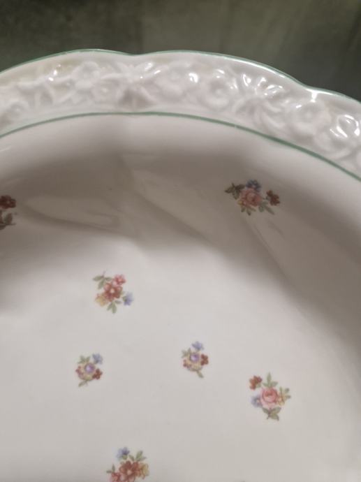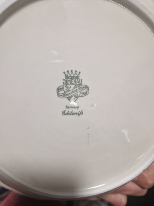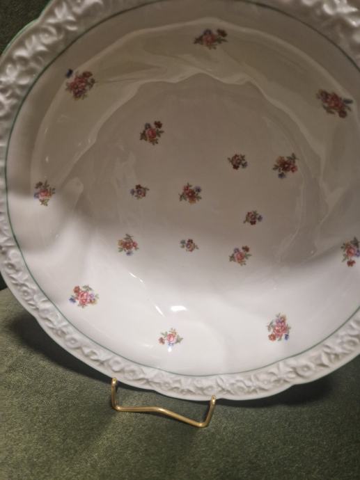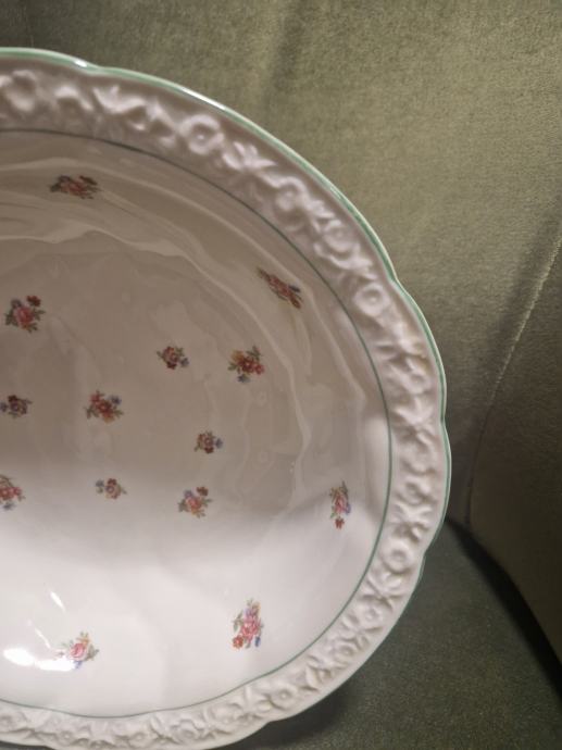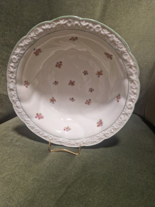 Boja bjelokosti, ručno oslikana, prekrasni reljefni rub, neokrhnuta. Promjer cca 26.5 cm a visina cca 6 cm.