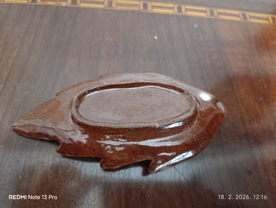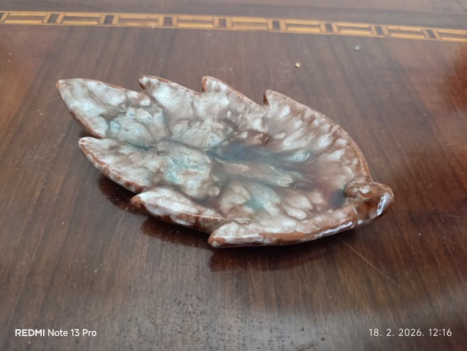 Prodajem keramički, unikatni, ukrasni tanjurić u obliku lista, glaziran u kombinaciji smeđe i više boja, vrlo lijepog efekta mramora. Dno je također glazirano smeđom bojom. Rukotvorina, dimenzije 15/9cm