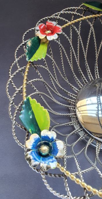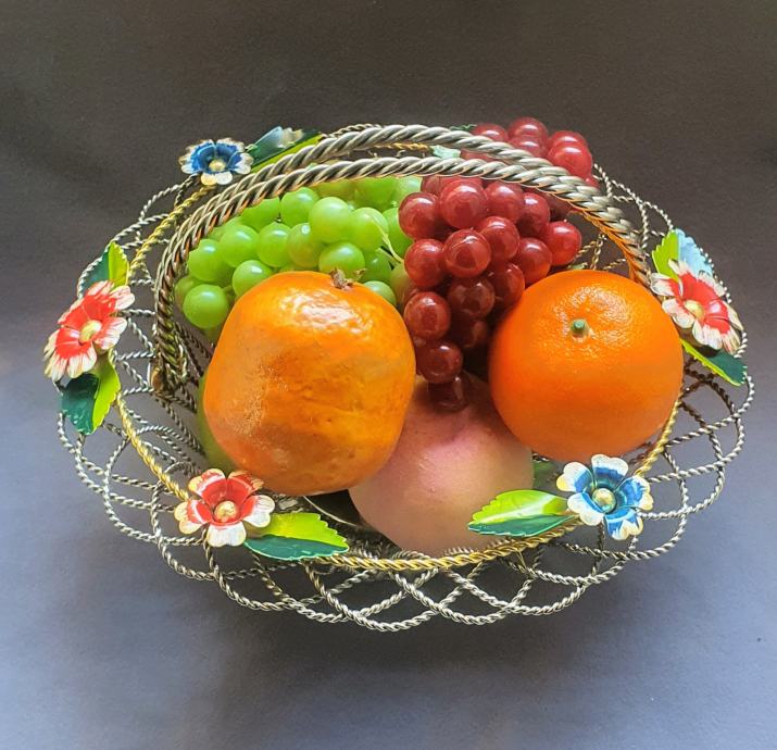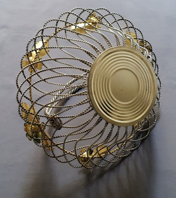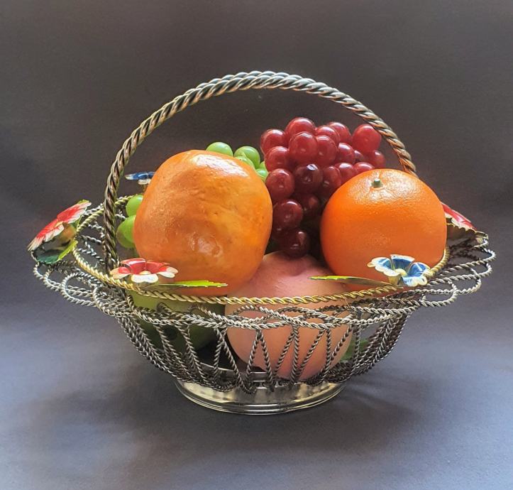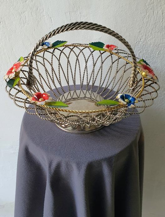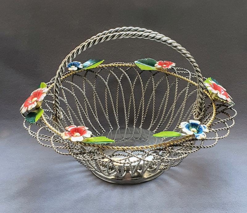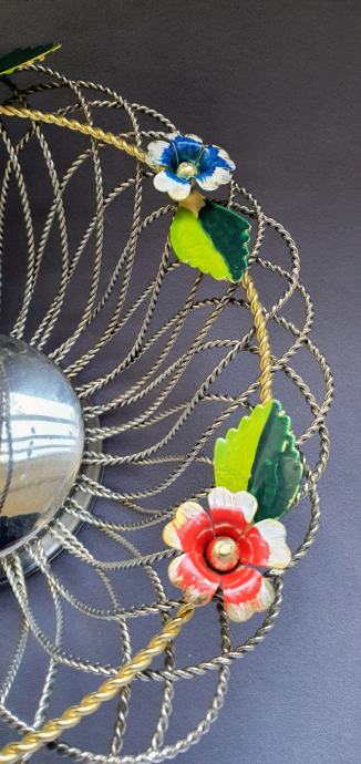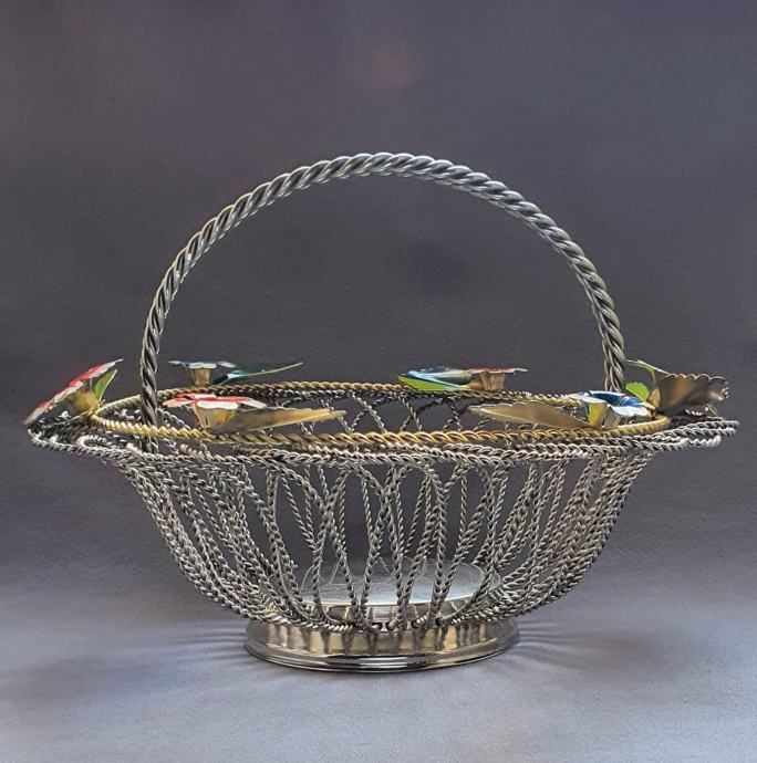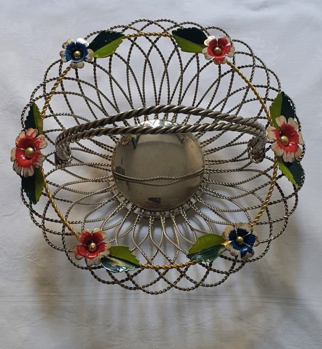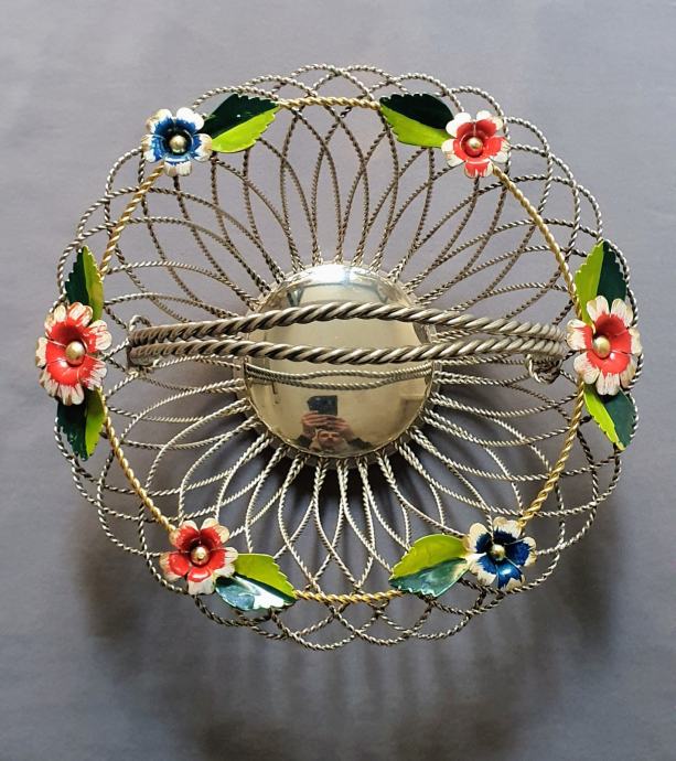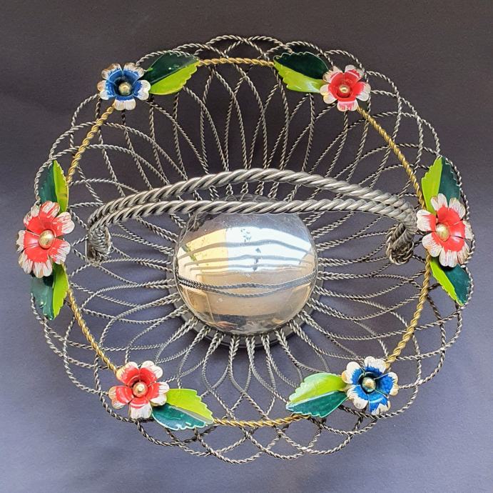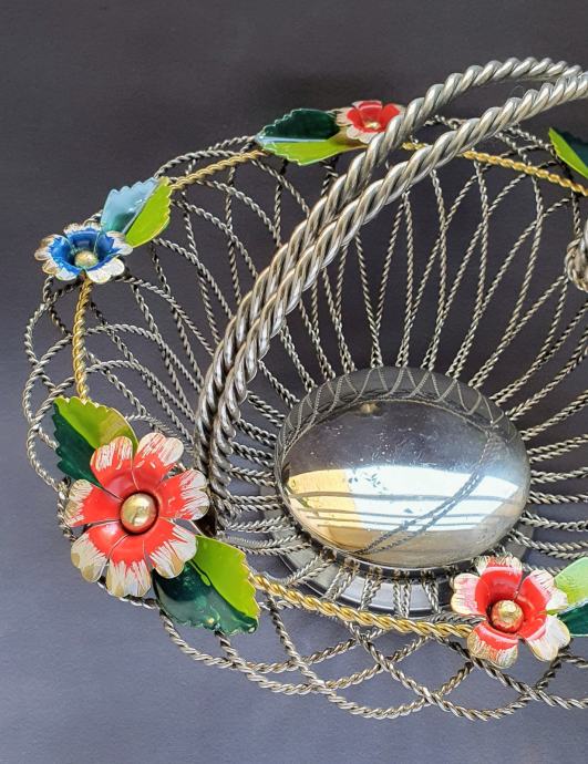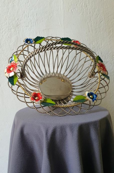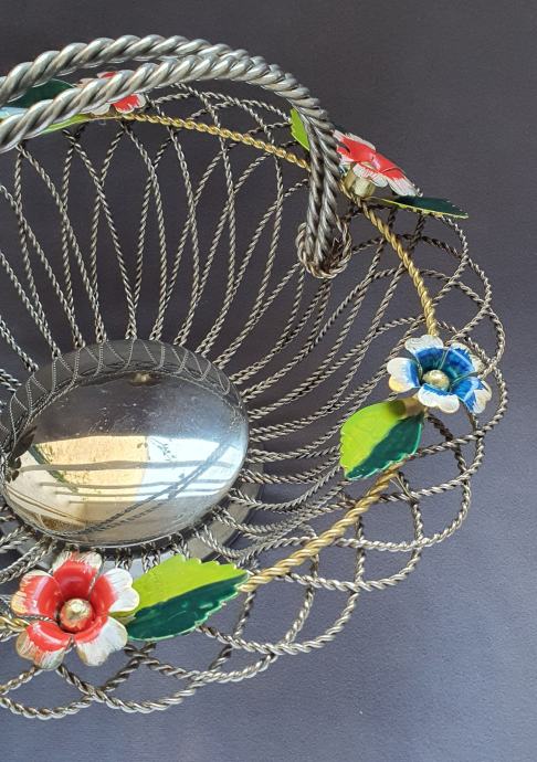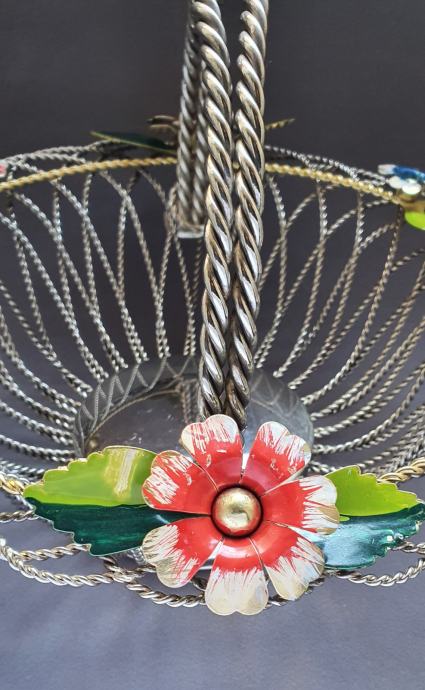 Krasna metalna košara ručno izrađeno od zavrčene metalne žice debljine 4 cm te 5cm pozlaćena i 8 mm ručke sa 6 ukrasnih metalnih cbietića oslikanih emajlom takoder ručno
