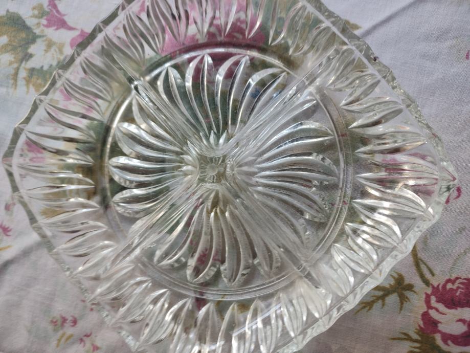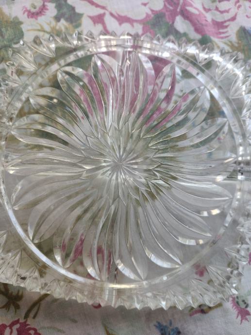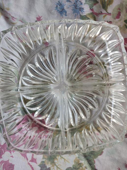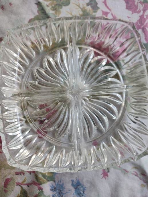 Kristalna posuda, lagano zaobljena, s četiri pregratka, za razne namjene (posluživanje grickalica ili slatkiša, ili za držanje nakita i raznih sitnica), u odličnom stanju