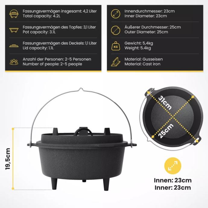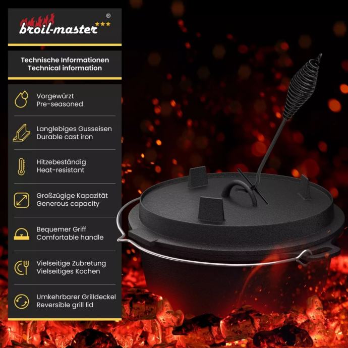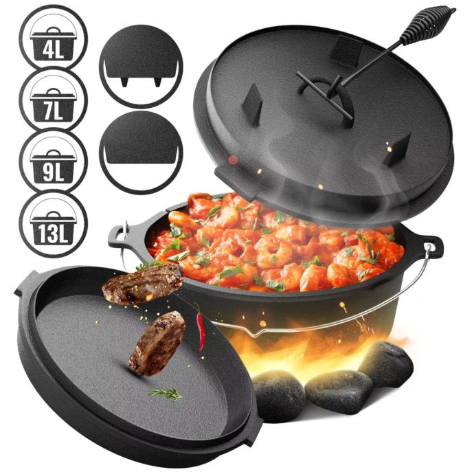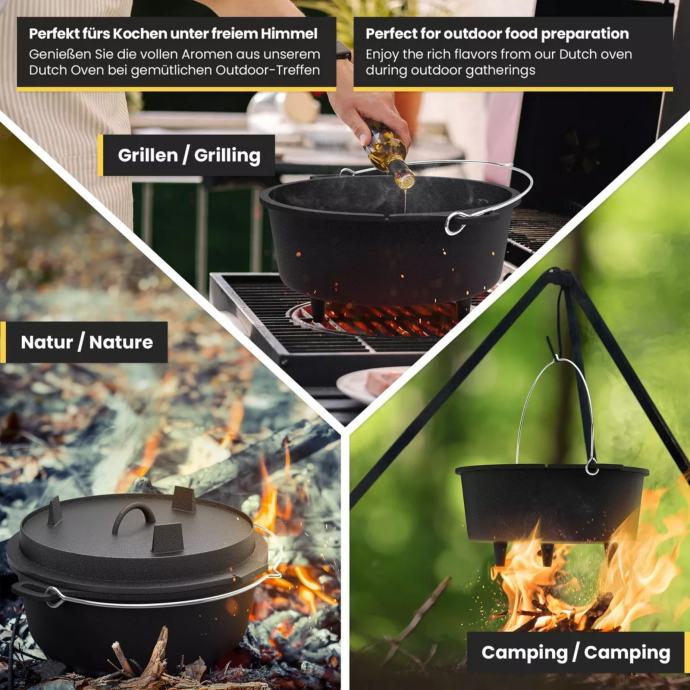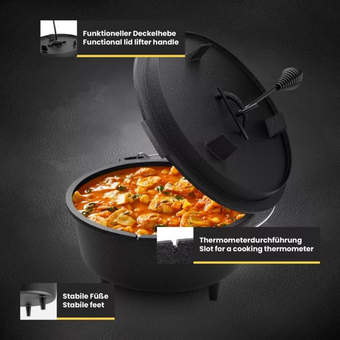 Otkrijte vrhunsku svestranost u kuhanju s našom pećnicom Dutch Oven, koja je izrađena od prethodno začinjenog lijevanog željeza i otporna je na toplinu do 400 °C.