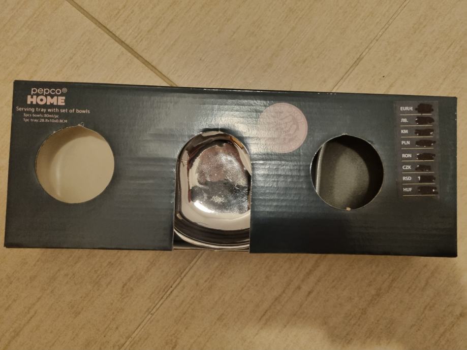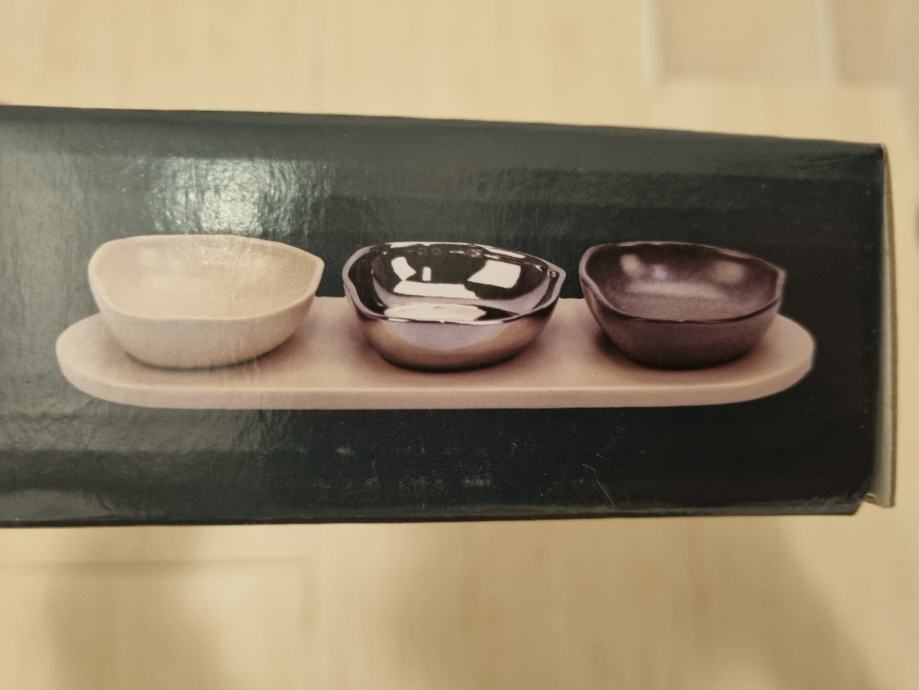Prodajem nov set Pepco Home podložak s 3 posude. Radi se o poslužavniku s tri manje zdjele u različitim bojama i završnim obradama – jedna je svijetla/bijela, jedna metalik srebrna i jedna tamno ljubičasta. Dimenzije poslužavnika su 28,5 x 11,5 x 4 cm. Cijena 3€